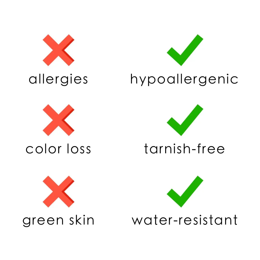 - Water, Sweat, and Heat Resistant. (No discoloration, No Tarnishing).