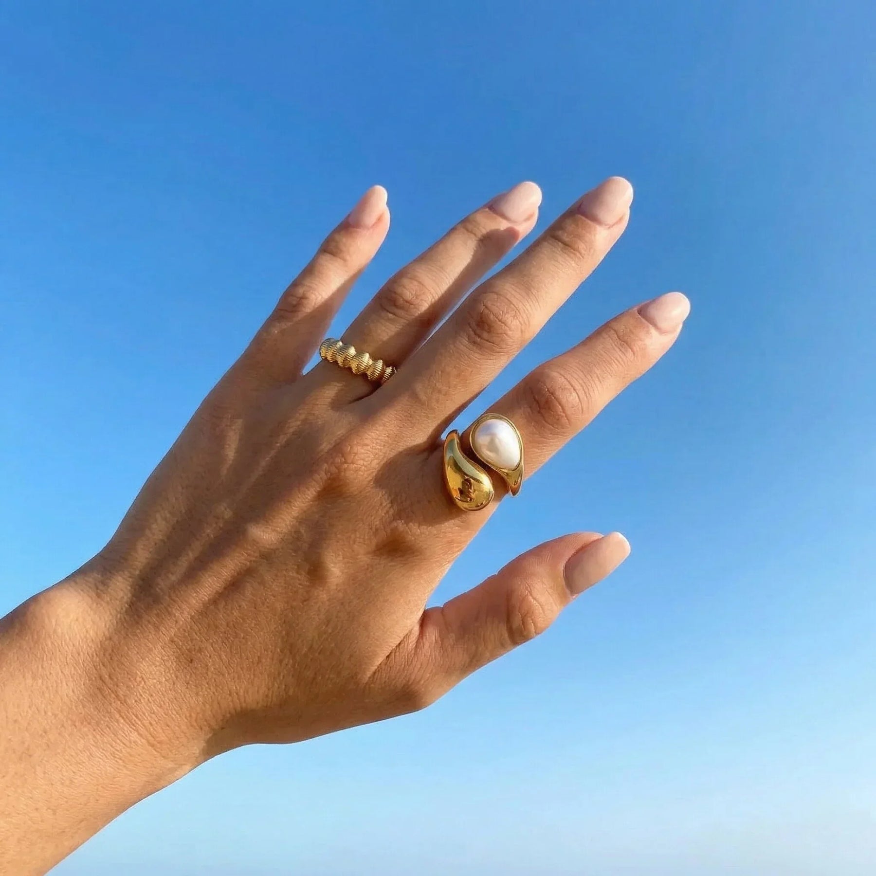 Choose your perfect pairing with AVARIA's Mara ring. This striking ring features a sculpted gold design and gives you the option of a classic freshwater pearl or a rich, earthy amber. Express your individual style with this versatile piece. As per AVARIA's standards, each piece is waterproof and hypoallergenic for worry-free wear.